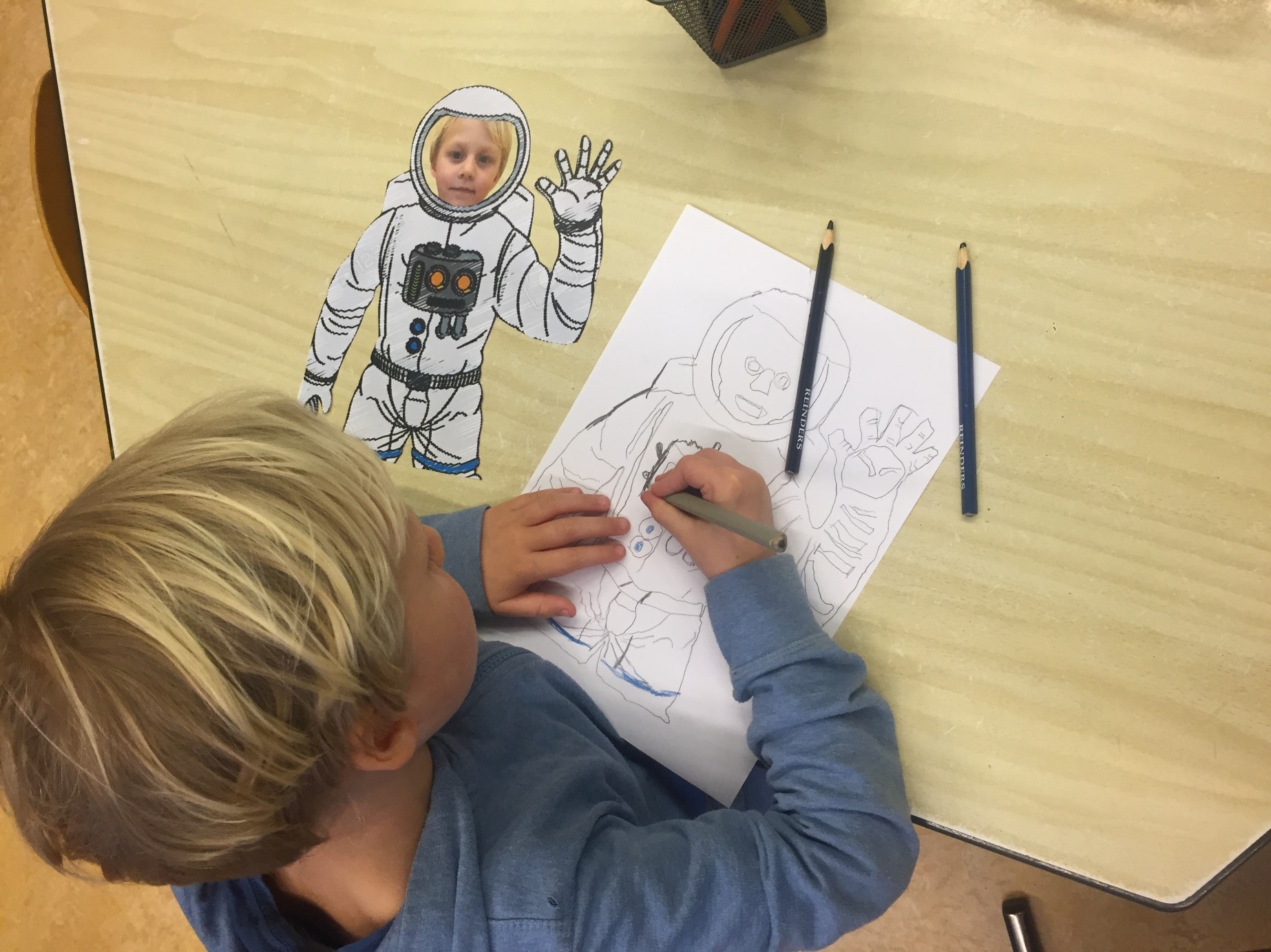 Juf Lee-Ann heeft de voorbeelden op de lichttafel geplakt met wit papier eroverheen. De leerlingen moesten eerst de lijntjes overtrekken en jeetje, wat ging dat goed! Goed kijken en rustig tekenen, dat kan groep 2 al! Daarna mochten ze hun eigen tekening inkleuren waarbij ze goed naar het voorbeeld moesten kijken om te zien waar welke kleur hoort.
